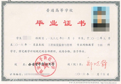 西安电子科技大学网络教育毕业证书样本