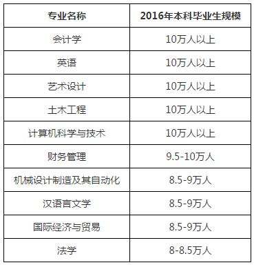 根据教育部阳光高考信息平台最新统计数据,2016年会计学、法学等10个普通高校本科专业的毕业生规模最大,其中会计学、英语、艺术设计、土木工程和计算机科学与技术等5个专业的毕业生超过10万人。