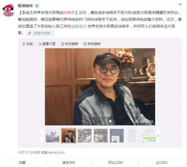 扮演过张三丰的武打明星李连杰发声支持太极再战徐晓冬 新浪娱乐微博截图