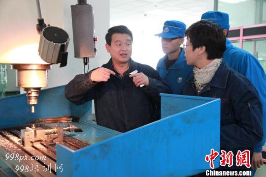 兰州石化职业技术学院学生,在老师的带领下,研究中国传统工艺,发扬工匠精神,在经过不断修改、实践后,制作出“地球仪”式金属鲁班锁。图为老师指导学生提高加工零件精确度。 刘玉桃 摄